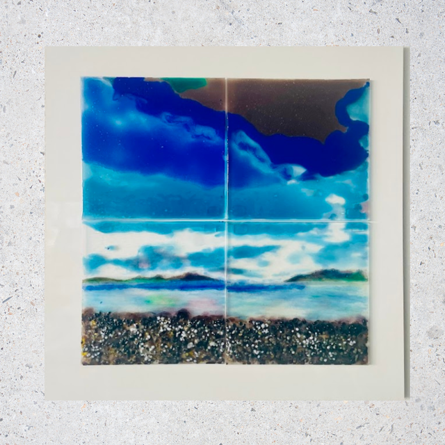 Een kleurrijke glaskunstimpressie geïnspireerd op het Noorse eiland Arnøya. In dit werk komen lucht, land en water samen in een harmonie van levendige kleuren en transparante lagen. Geschilderd met glas, vangt het stuk het veranderlijke Noorse licht en de serene kracht van het landschap.