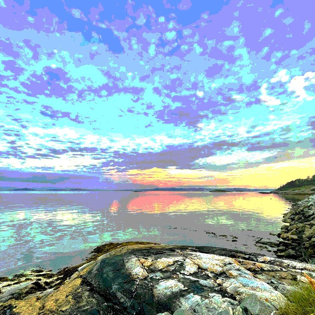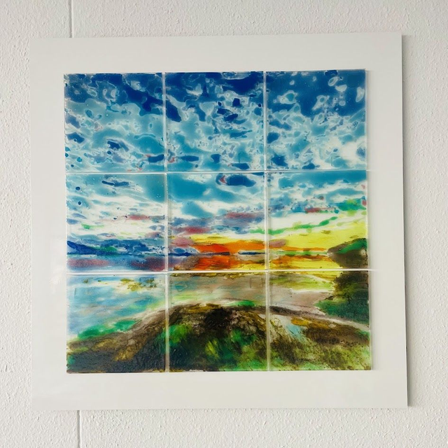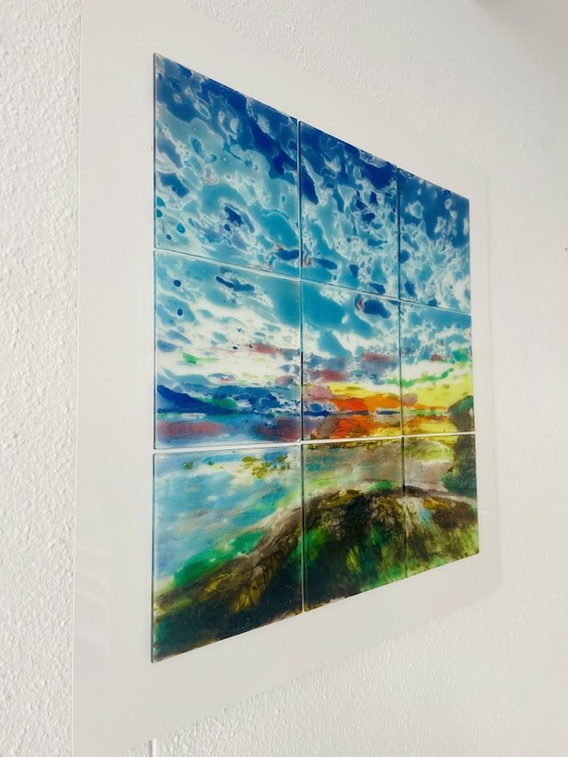 Een kleurrijke glaskunstimpressie geïnspireerd op het Noorse eiland Fjellværsøya. In dit werk komen lucht, land en water samen in een harmonie van levendige kleuren en transparante lagen. Geschilderd met glas, vangt het stuk het veranderlijke Noorse licht en de serene kracht van het landschap.