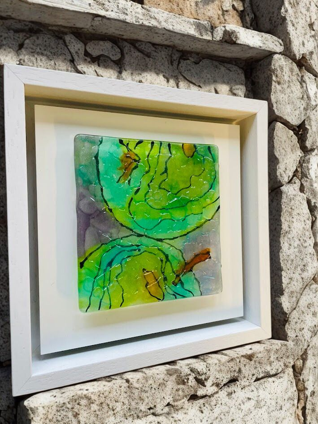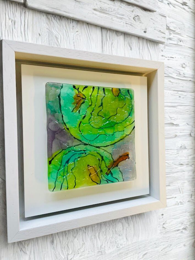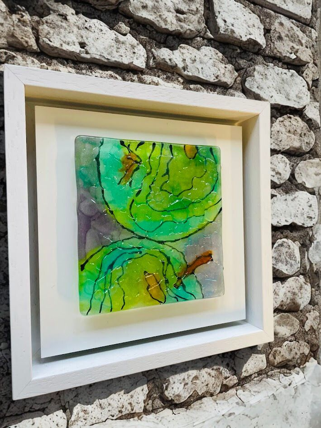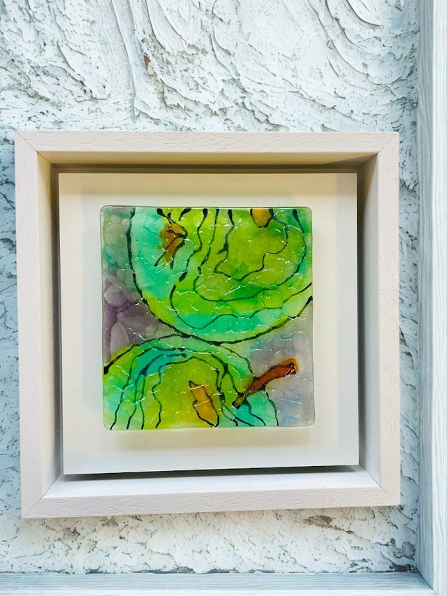 Fresh Green Apples - Glas sculptuur 10x10 - op wit aluminium 14x14 - in wit houten baklijst 17x17