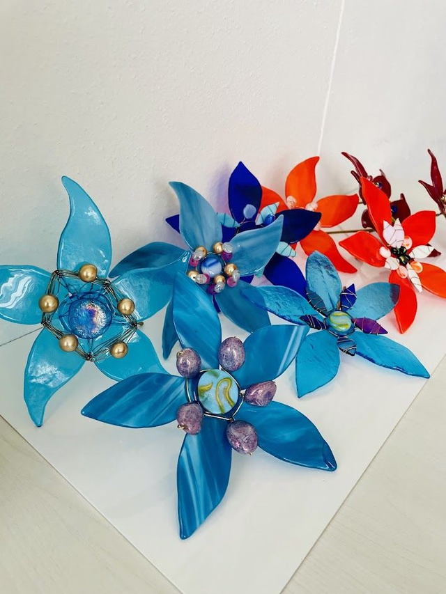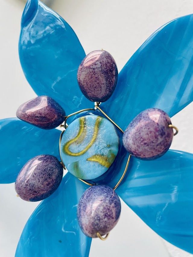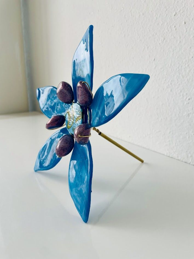 Blauwe Maan - Breng een serene sfeer in uw buitenruimte met deze handgemaakte "Blue Moon" glazen bloem. De bloembladen zijn vervaardigd uit helder, ijsblauw glas dat prachtig speelt met het binnenvallende zonlicht. Het hart van de bloem is opgebouwd uit gelaagd wit glas, versierd met een schitterende centrale kraal en verfijnd draadwerk.