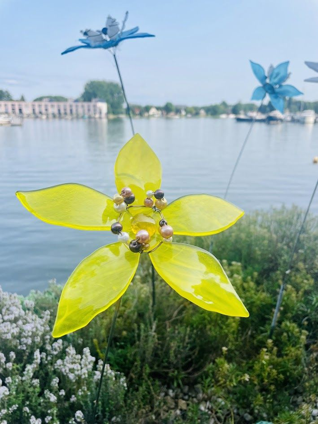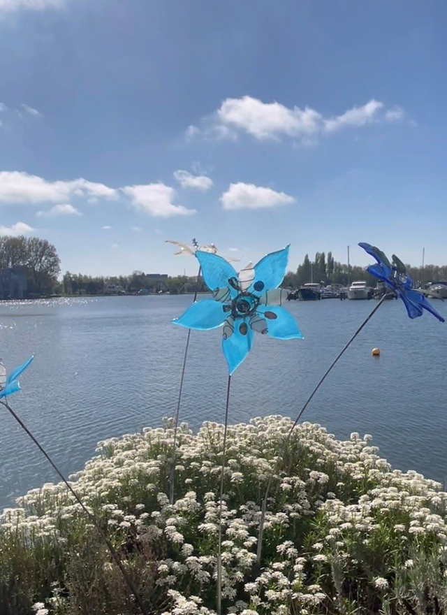 Handgemaakte Blauwe Glazen Waterlelie Bloem - Ranke Lelie bloem van zacht blauw glas, gedecoreerd met glas en decoratie elementen. Wanneer gemonteerd op een ranke rvs buis wuiven ze prachtig in de wind.