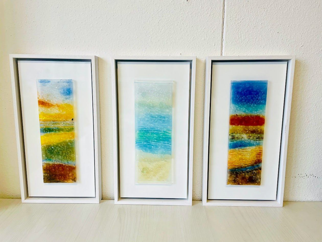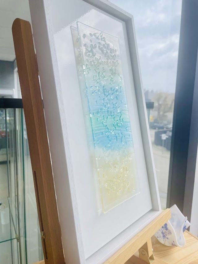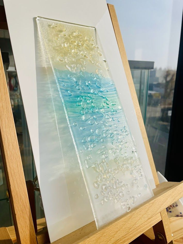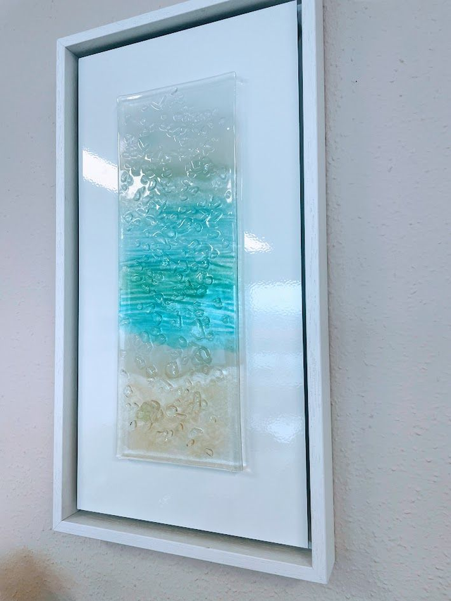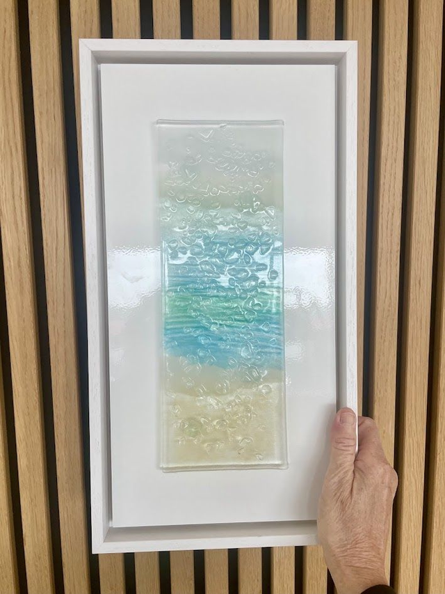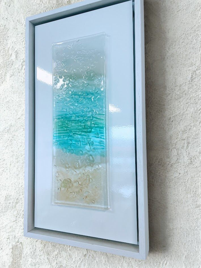 Strandkunst Glaspaneel 12x30 - op wit aluminium 20x40 - in wit houten baklijst 23x34 - Glasschildering met reliëf