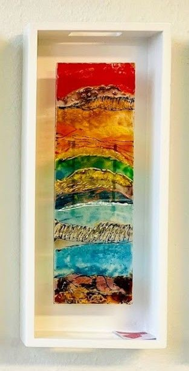 In deze serie van vijf reliëfs, ontvouwt zich een abstract landschap in lagen van kleur en textuur, die doen denken aan gelaagd gesteente, getijdenlijnen en weidse luchten bij zonsopkomst.