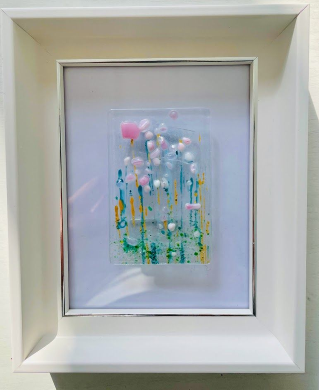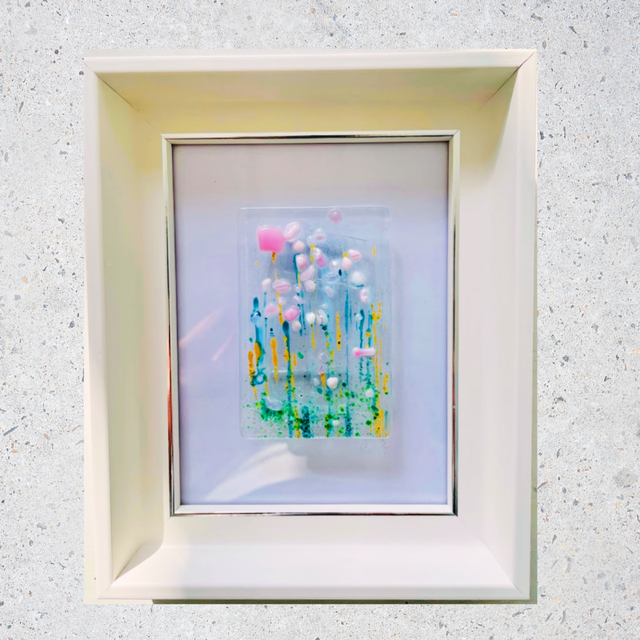 Kleurrijk glaskunst paneel in fusietechniek (7,5 x 5 cm), waarin licht en kleur samenkomen in een uniek abstract spel. Ingelijst in een luxe witte houten lijst met zwevende montage.